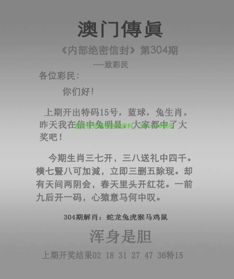 | 2025-304期传真: 今期生肖三七开,三八送礼中四千。 横七豎八可加減,立即三删五除现。 却有天间两阴会,春天里头开红花。 一前九后开一码,心猿意马何中叹。 解:今期生肖三七开,三八送礼中四千。三七解蛇,三八解龙,四解虎,横七豎八可加減,立即三删五除现。七解猪,八解狗,三解兔,五解牛。却有天间两阴会,春天里头开红花。春肖兔虎龙,红肖鼠马兔鸡。一前九后开一码,心猿意马何中叹。明肖马。 综合:蛇龙虎猪狗兔牛鼠马 |